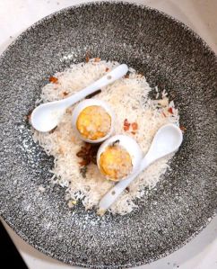 Appetizer: Deviled Egg – palabok flavour, chicaron, green onions, lemon-fried garlic
