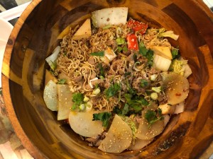 Main: Chinese Malaxiangguo – choice of Chicken, Beef or Lamb, and Imitation Crab Stick, Fish Tofu, Potato Slices, Chinese Cabbage, and choice of Regular Noodles or Wide Rice Noodles